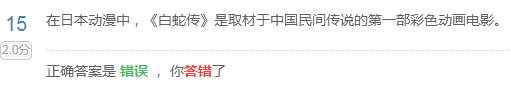我觉得其中所属关系错误,题目是指中国民间传说的第一部彩色动画电影是《白蛇传》,而实际上中国第一部彩色动画片是《乌鸦为什么是黑的》(1955年)