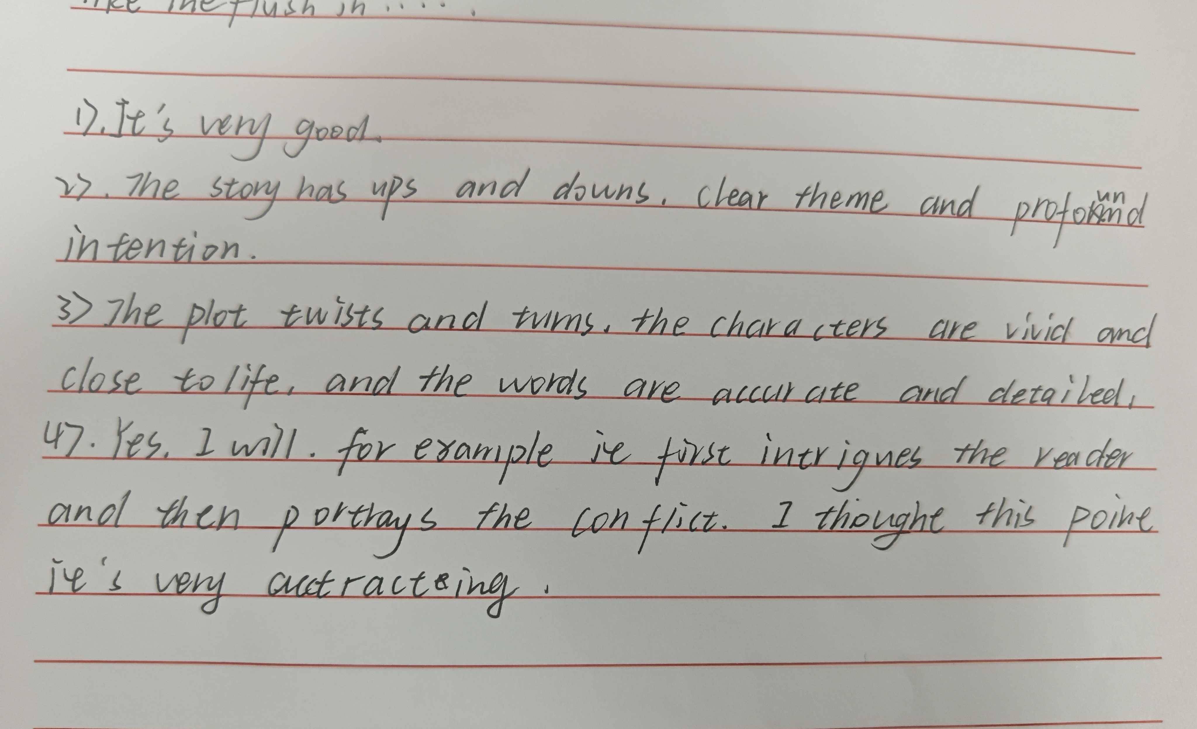 (2) I think that to write a compelling story, you need to introduce an interesting beginning. A good beginning of a story will immediately catch the reader's attention. Need to develop clear goals and conflicts, An unforgettable plot needs to have a clear goal and conflict.