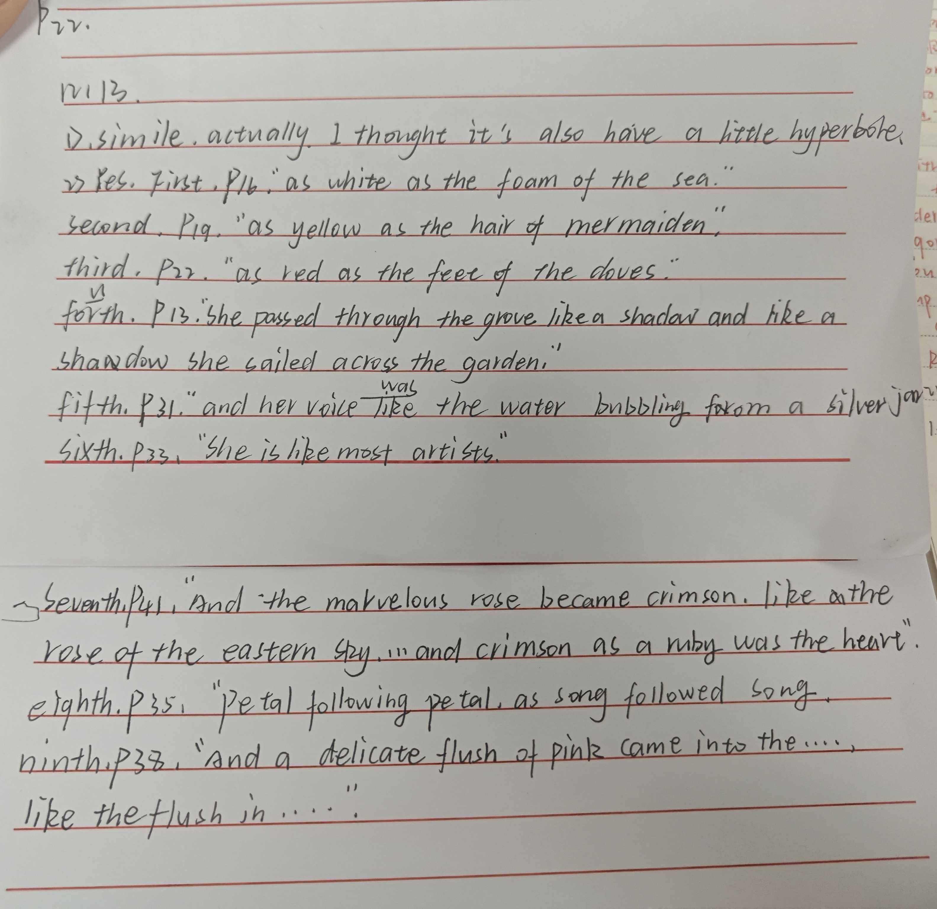 For example:P19.as yellow as the hair of the mermaiden.P22.as red as the feet of the doves,and readder than the great fans of coral. P31.and her voice was like the water bubbling from a silver jar.P38.and a delicate flush of pink came into the leaves of the rose,like the flush in the face of the bridegroom when he kisses the lips of the bride.P41.and the marvelous roes became crimson,like the rose of the eastern sky.
