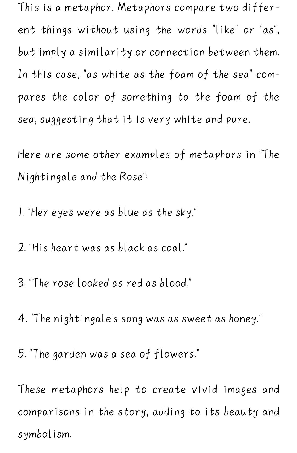 For example: 1. In paragraph 16: "as white as the foam of the sea". 2. In paragraph 19: "as yellow as the hair of the mermaiden". 3.In paragraph 41"And the marvelous rose became crimson,like the rose of the eastern sky'',ect.