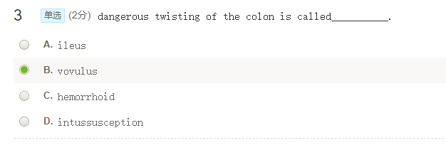 答案应该是:肠扭转,此题选项中B是拼写错误,应该为volvulus.