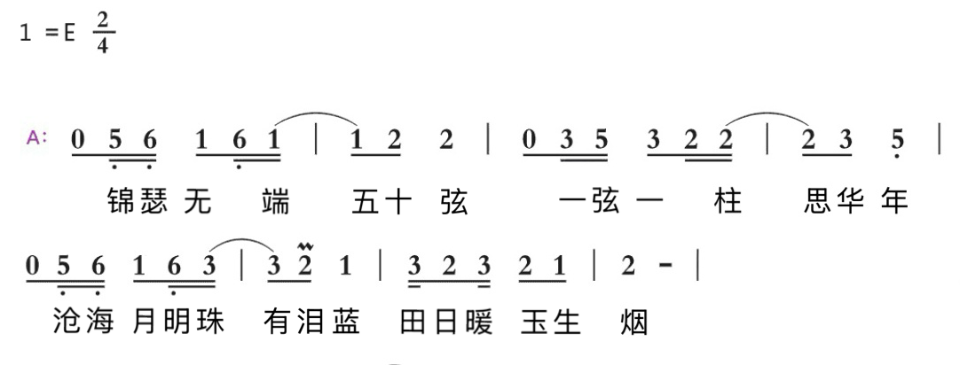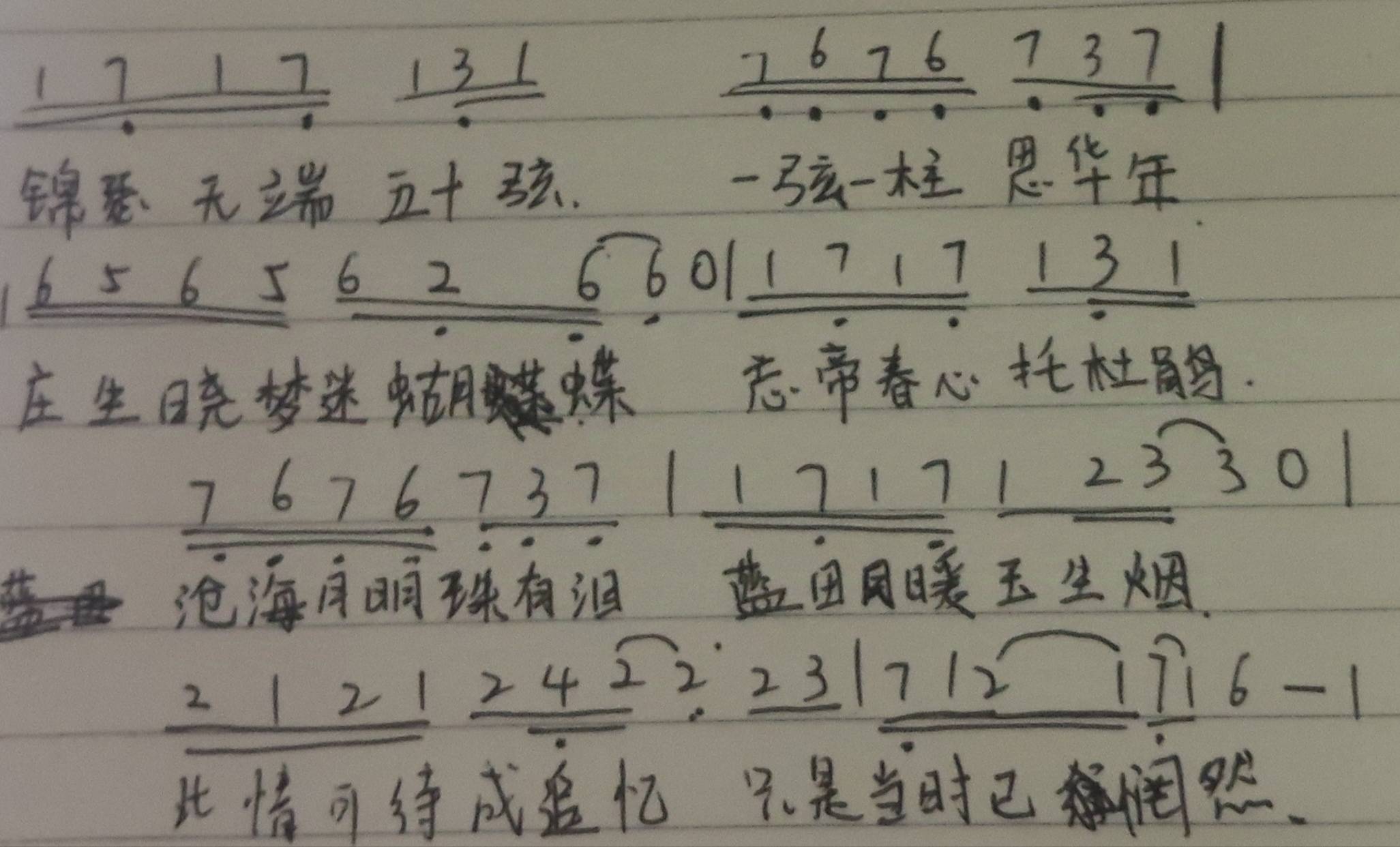 [钢琴轻柔开场] → [古筝悠扬加入] → [人声清唱:“锦瑟无端五十弦”] → [弦乐颤音效果在“五十弦”处点缀]