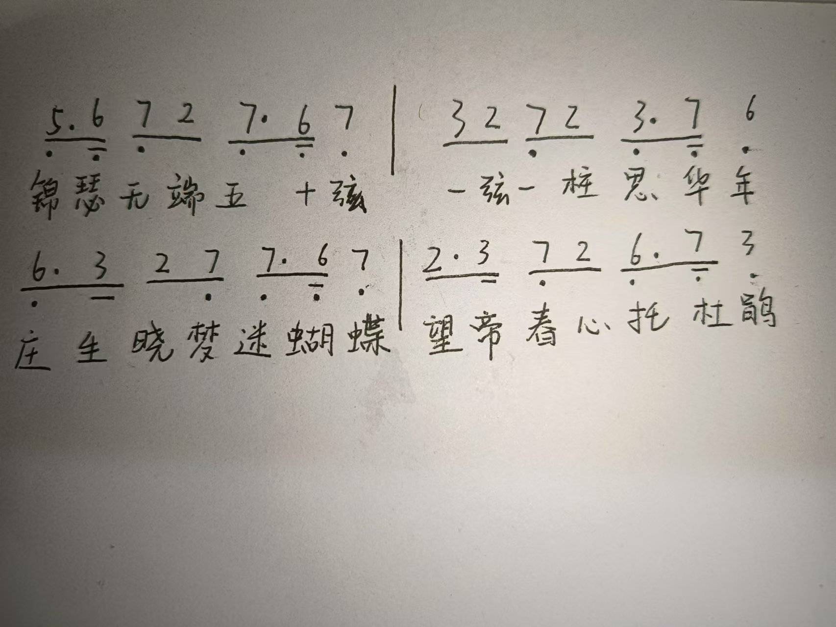 庄生晓梦迷蝴蝶,望帝春心托杜鹃”的意境融入音乐中,可以通过快速变化的旋律和和弦来模拟梦境的迷离与变幻,同时用长笛的悠扬旋律来象征杜鹃的悲鸣,表达出对逝去时光的深深眷恋和无奈。