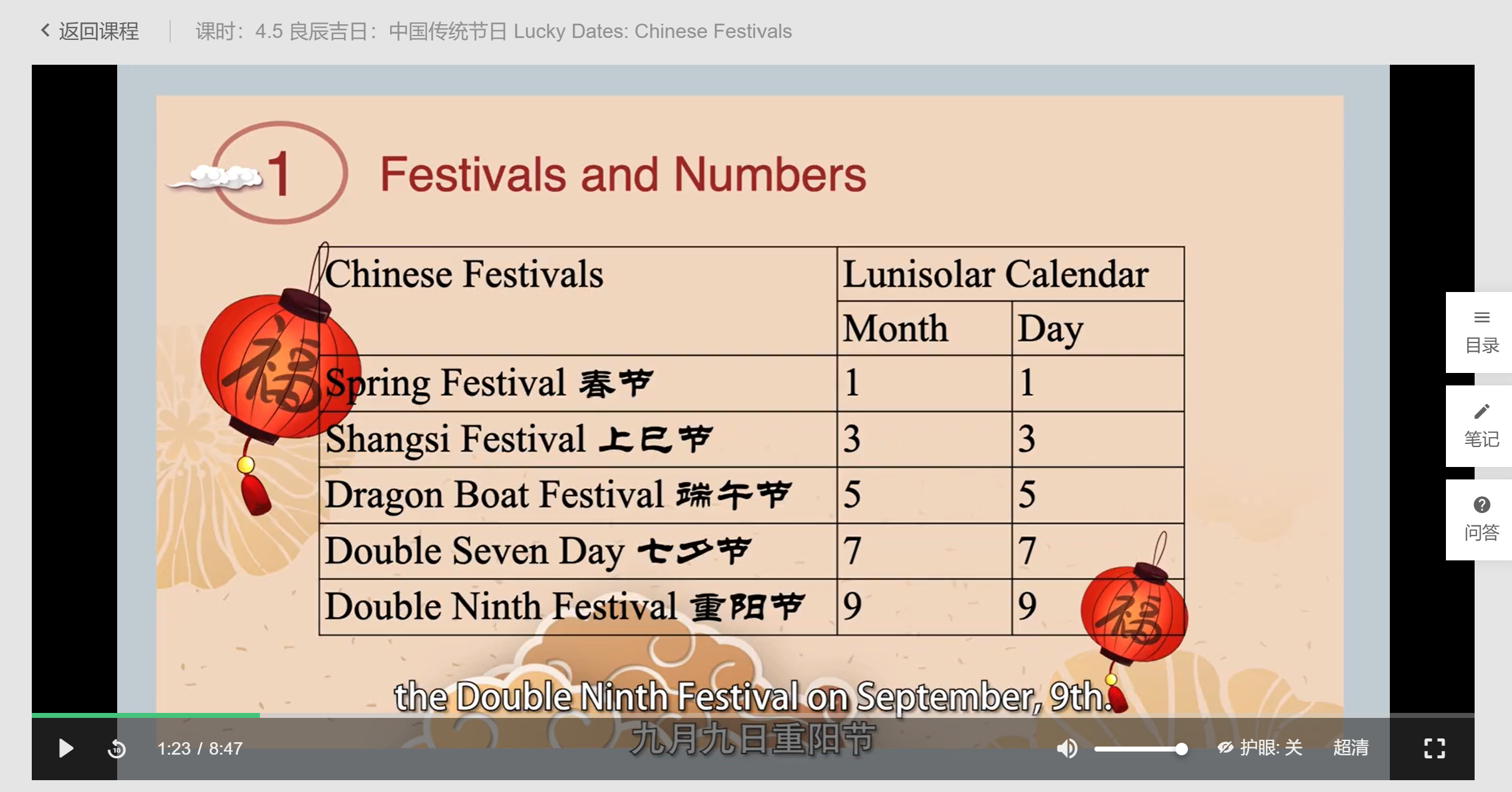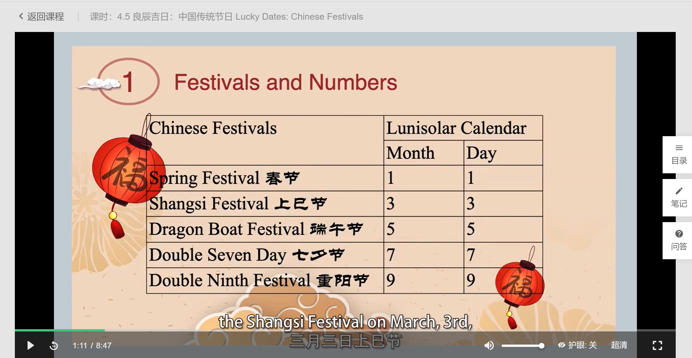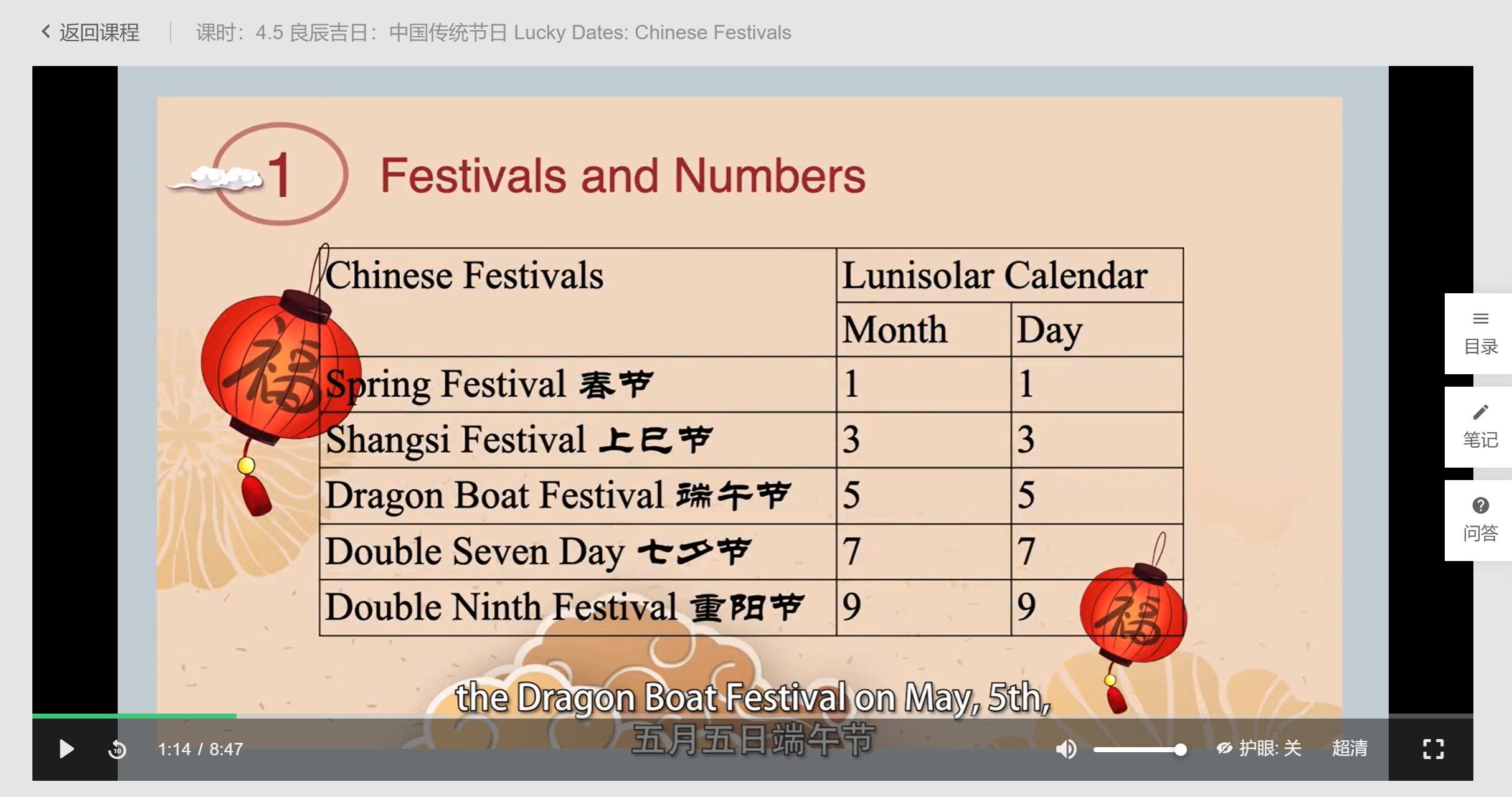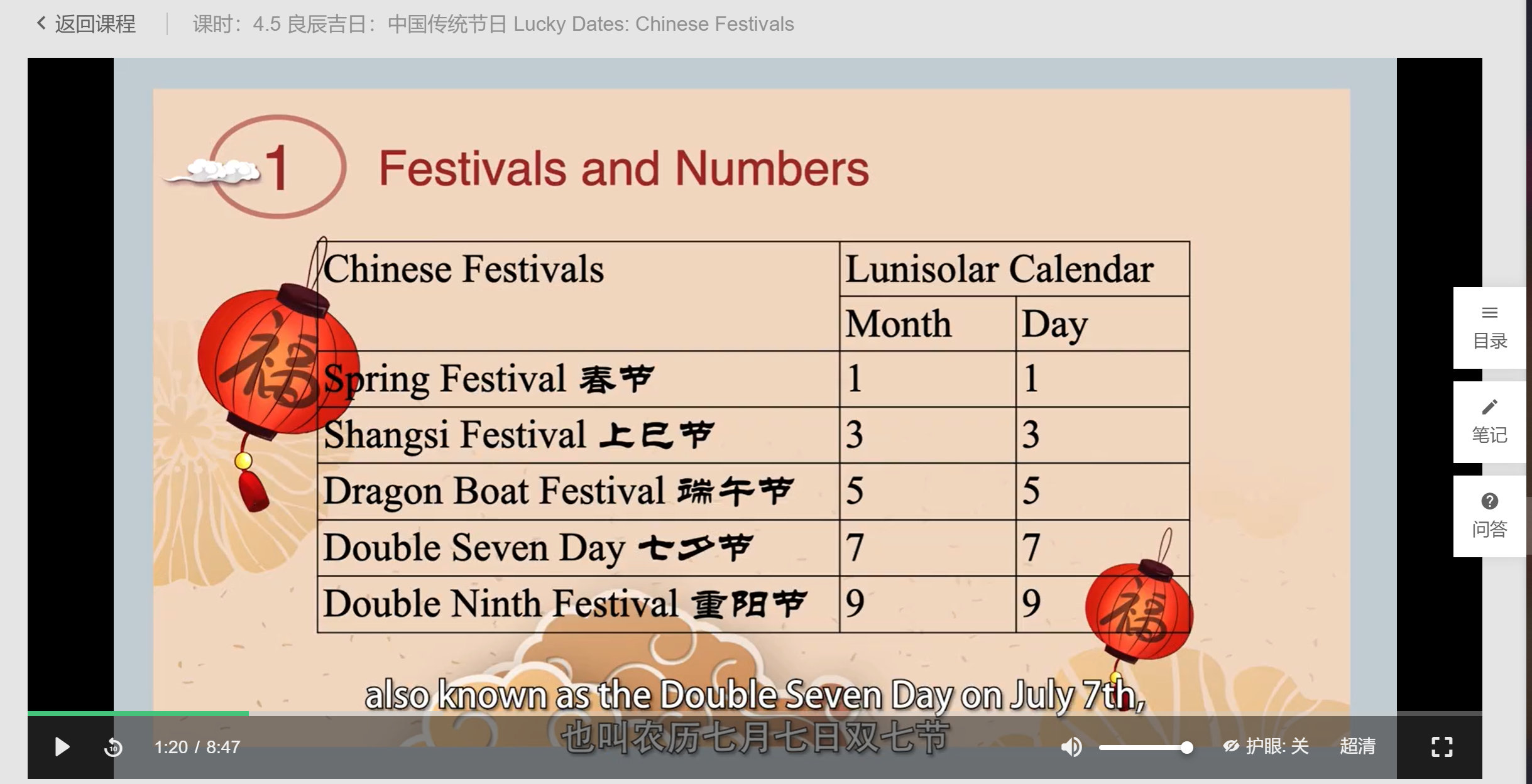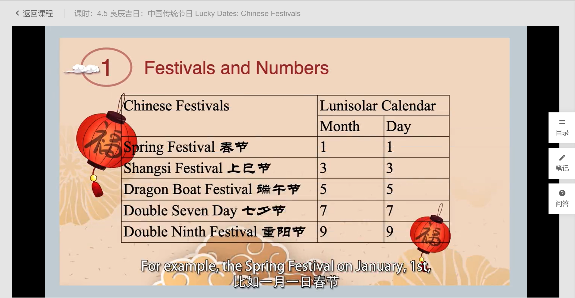 我注意到这节课里介绍传统节日的日期时,用了太阳历的说法,比如春节表达为在January 1st,七夕在July 7th,以及端午,重阳都如图,用了太阳历计算时间的方法。