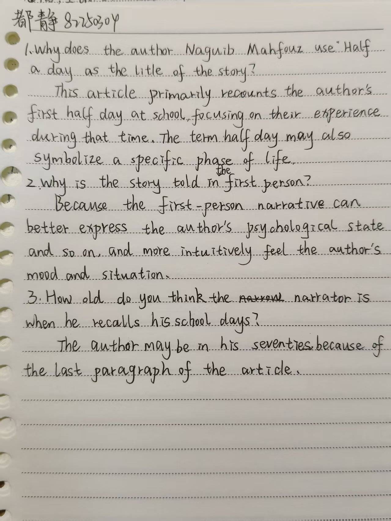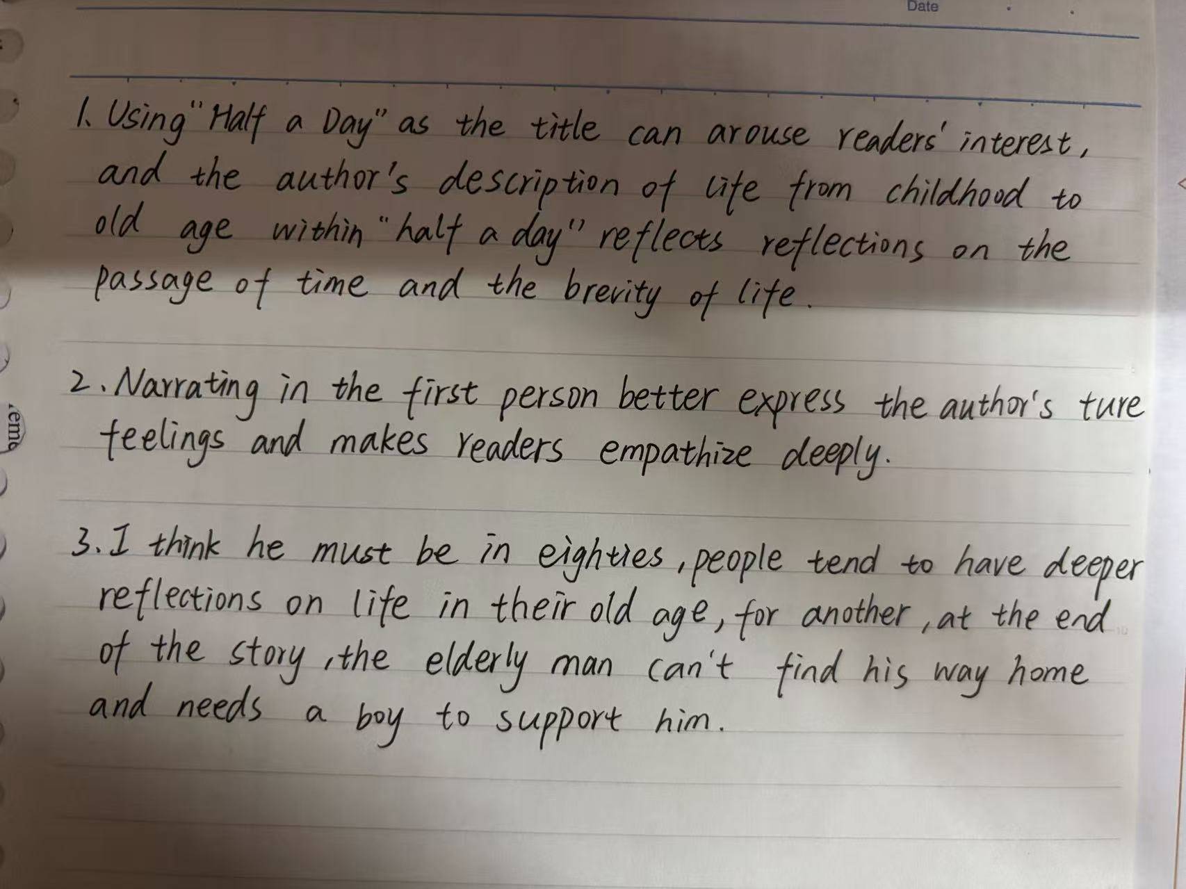 3. I think the narrator is an old man when he is recalling. At the end, it is written that he stands at the school gate, finding that the familiar way home has vanished, surrounded by "racing cars", "skyscrapers" and "noise". He feels confused and needs to "wait for a long time" to cross the road. This depicts an image of an old man who is out of touch with society and moves slowly. He uses the review of his "half-day" experience at school to metaphorically summarize his fleeting yet long life.