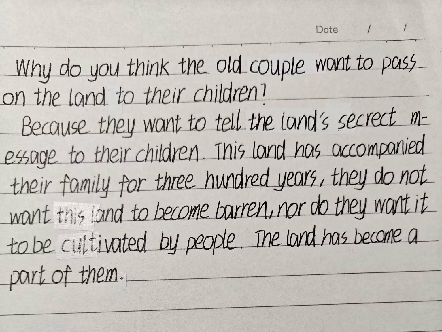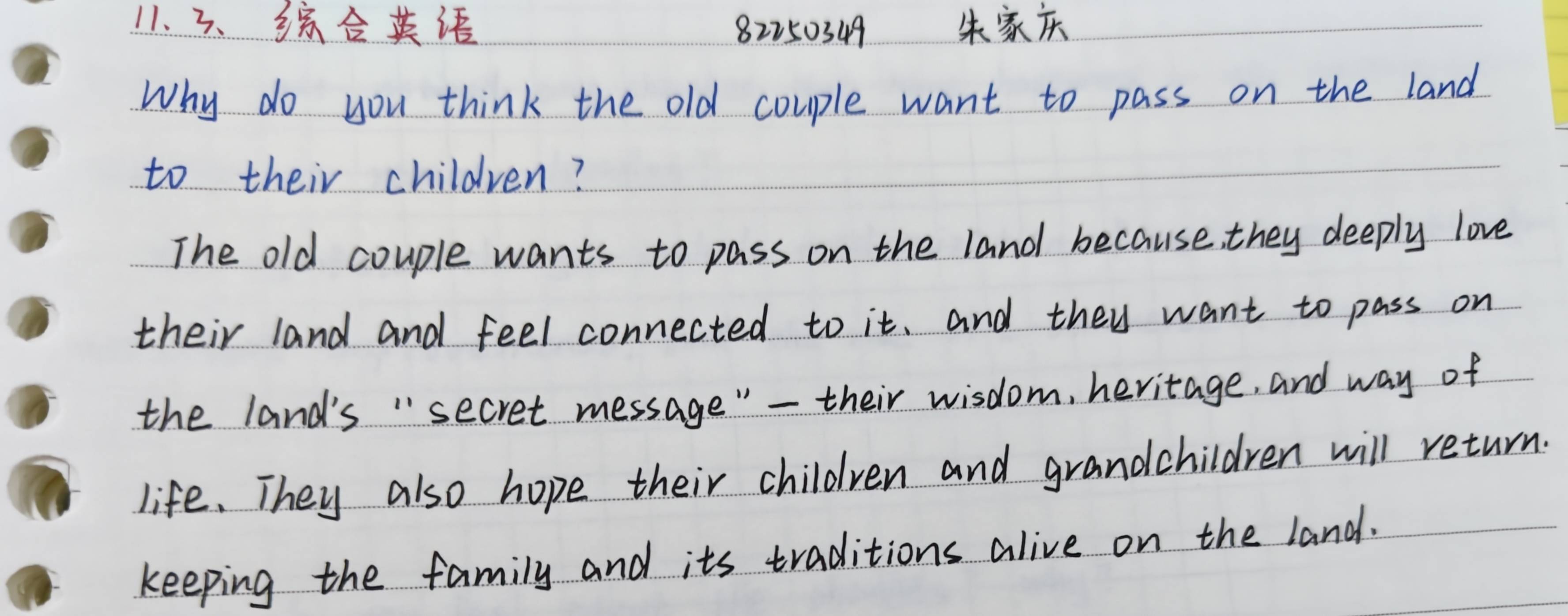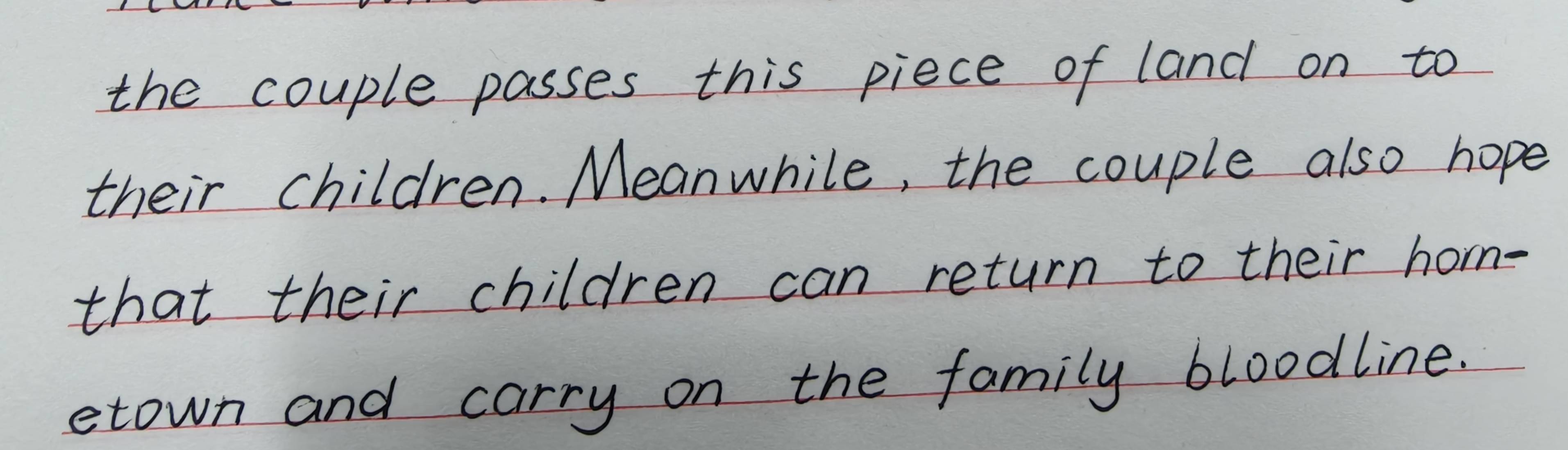 I think there are two reasons why the elderly couple want to pass the land on to their children. The first is that the couple are already very old, as the article mentioned "get old and exhausted", they are no longer capable of doing very tiring farming work and hope that their children can inherit this land. The second is that while the couple love this land, they also miss their children. "l love this land and hope one of my children comes back one day to live""it seems that none of them will ever come back to live here again."They know that their children have flown to a larger world and may not come back, but they themselves cannot leave. They can only hope that their children will come back one day and inherit the land,or pass it on to their grandchildren to ensure that this land can continue and the family roots can also be sustained.