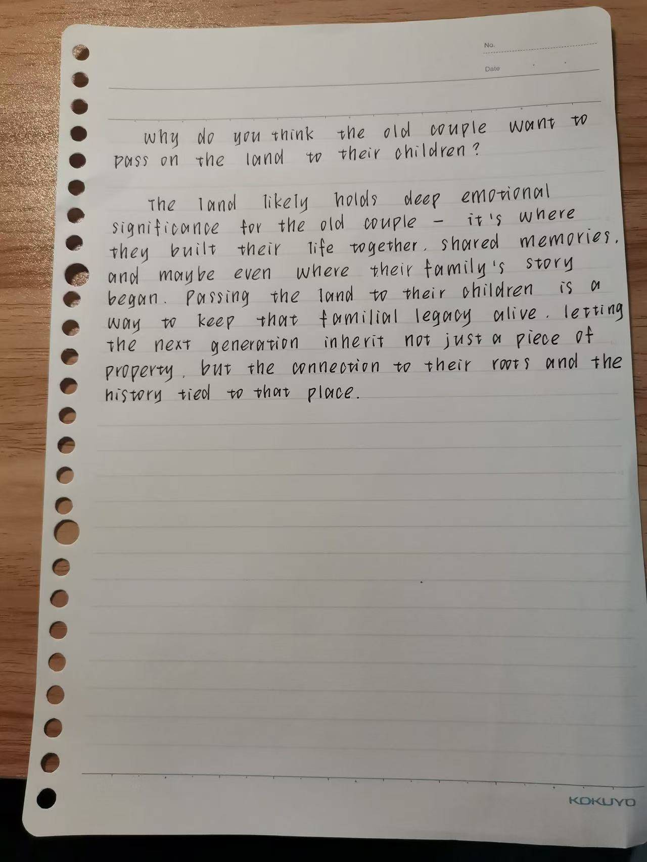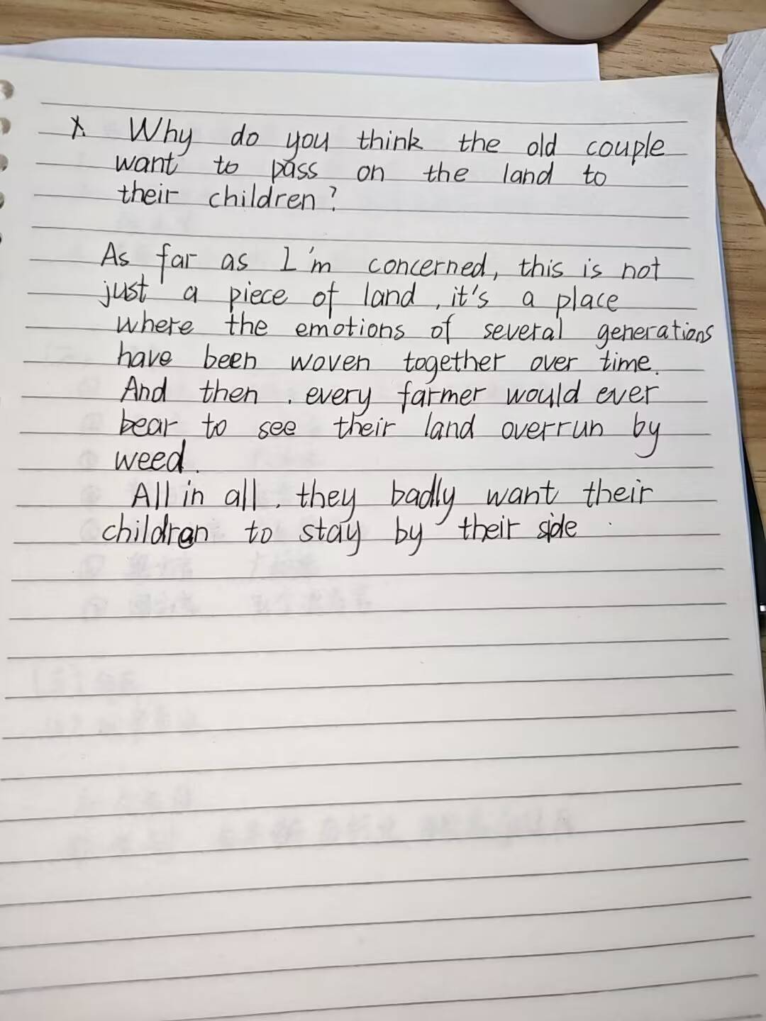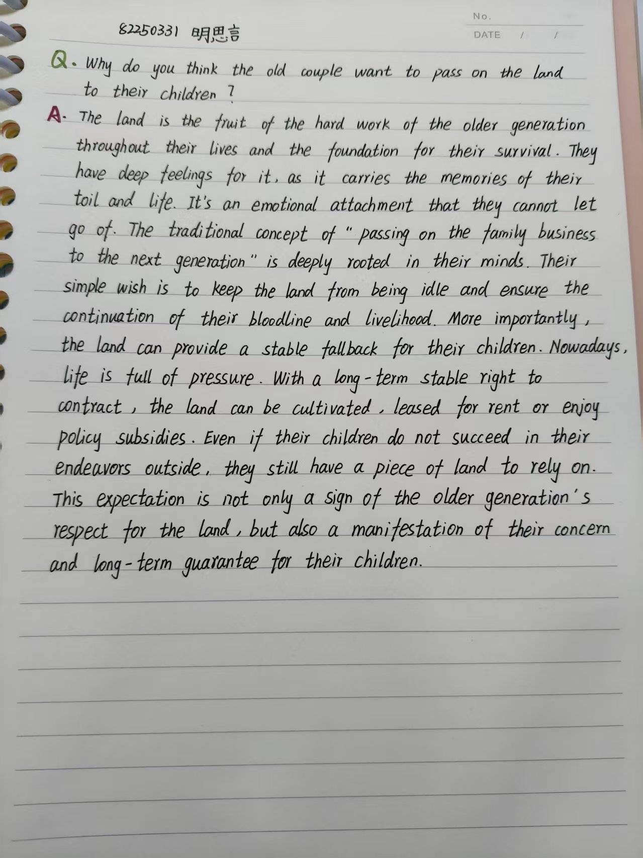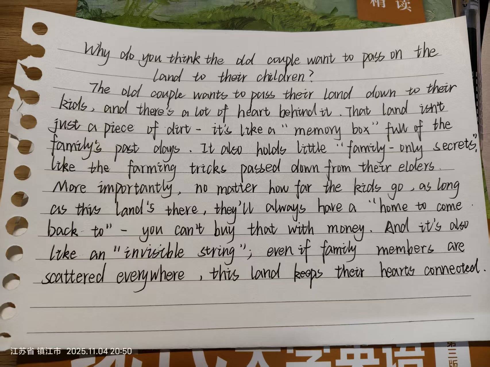 I think there are two reasons why the elderly couple want to pass the land on to their children. The first is that the couple are already very old, as the article mentioned "get old and exhausted", they are no longer capable of doing very tiring farming work and hope that their children can inherit this land. The second is that while the couple love this land, they also miss their children. "l love this land and hope one of my children comes back one day to live""it seems that none of them will ever come back to live here again."They know that their children have flown to a larger world and may not come back, but they themselves cannot leave. They can only hope that their children will come back one day and inherit the land,or pass it on to their grandchildren to ensure that this land can continue and the family roots can also be sustained.